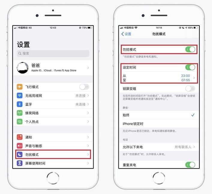 首先打开苹果手机的【设置】,找到【勿扰模式】,点击进入后,将开关按钮给打开,然后设定一个时间区间,表示这个时间内,来电通知都将是静音。