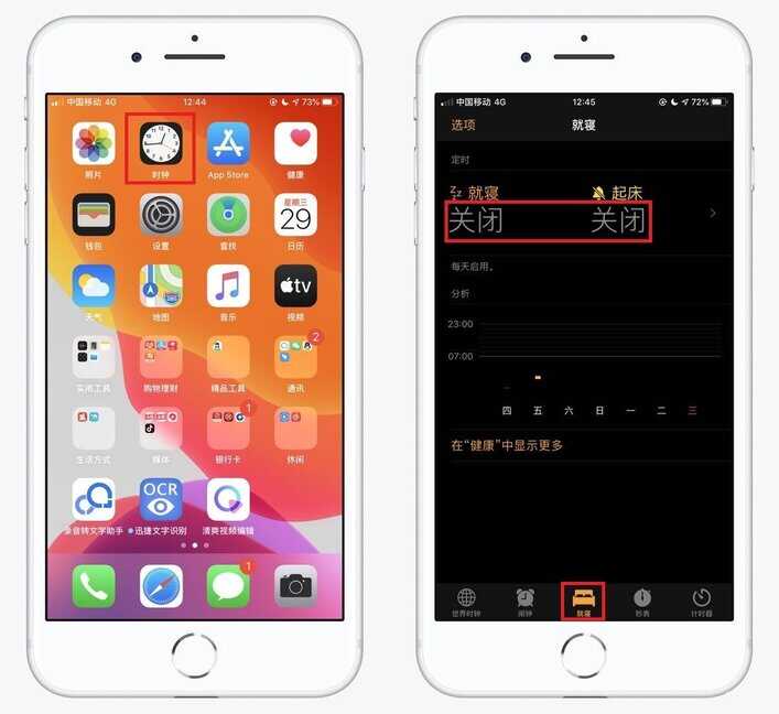 接下来在桌面上找到【时钟】应用,我们平时都是在这里设置闹钟的,在底部还有【就寝】功能,切换到这个功能后,点击定时下方的【关闭】按钮。