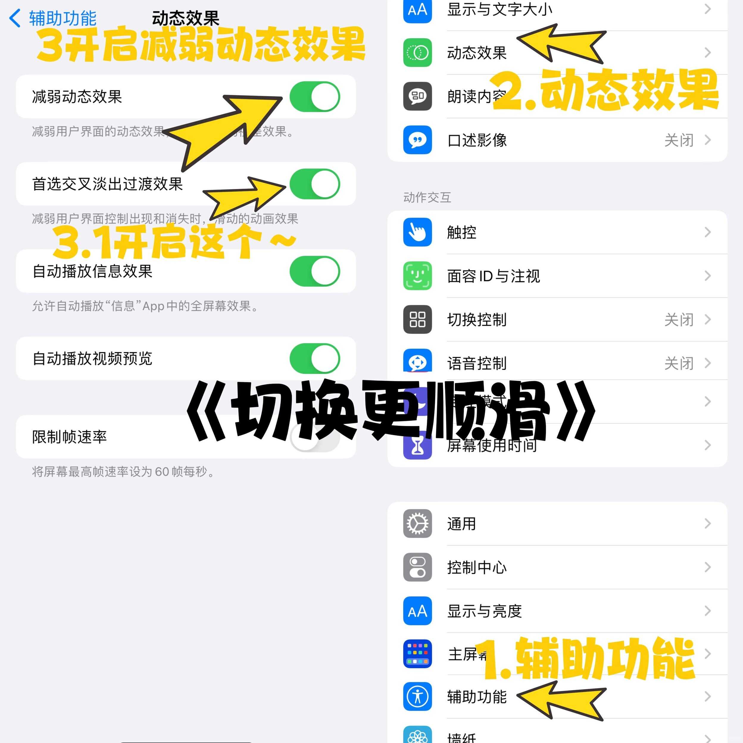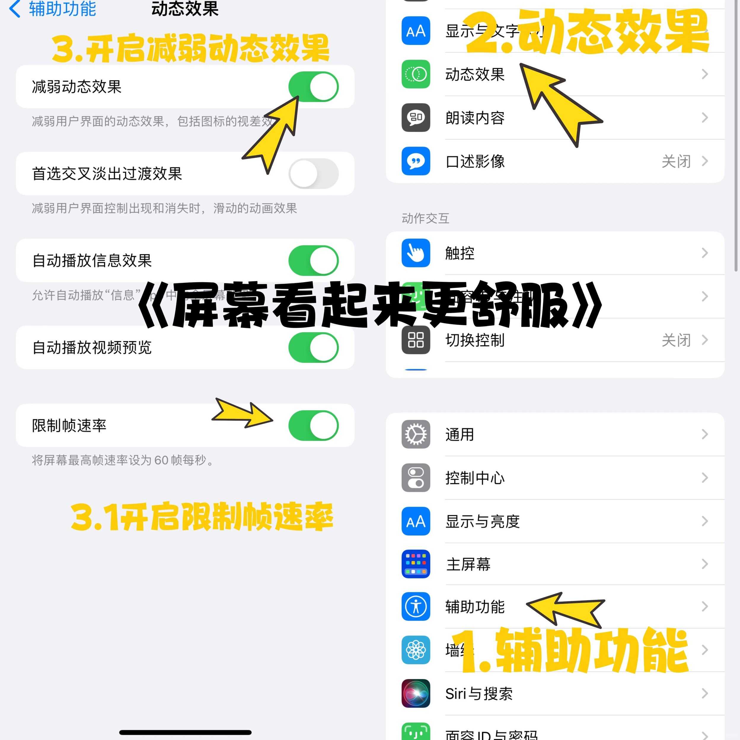 4⃣️设置-辅助功能-动态效果-开启减弱动态效果-在开启限制帧速率(屏幕看起来更舒服)