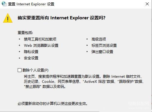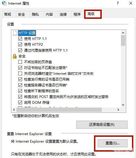 3.在Internet属性中找到“高级”选项,然后单击“重置”,然后重新启动计算机。