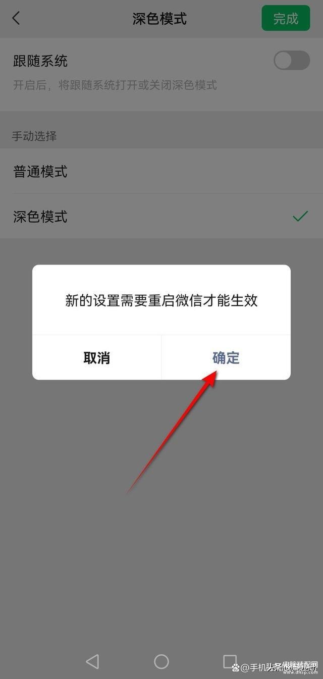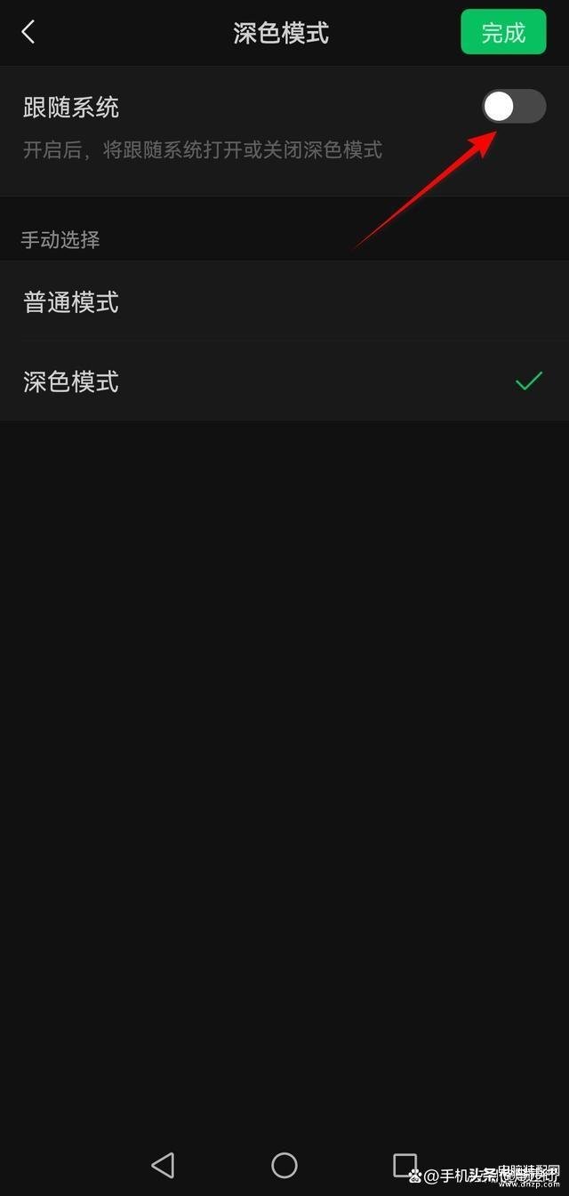 在夜间模式下,勾选“普通模式”,点击“完成”,或点击将“跟随系统”旁的小滑块点亮。
