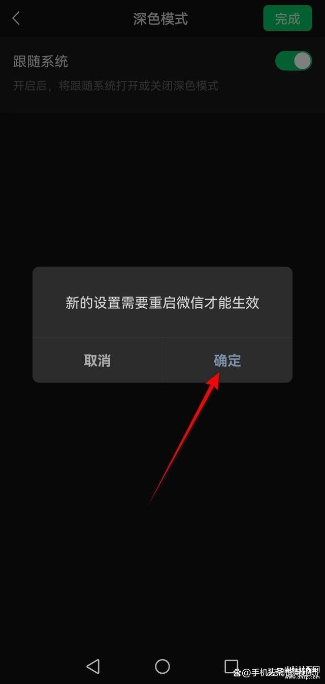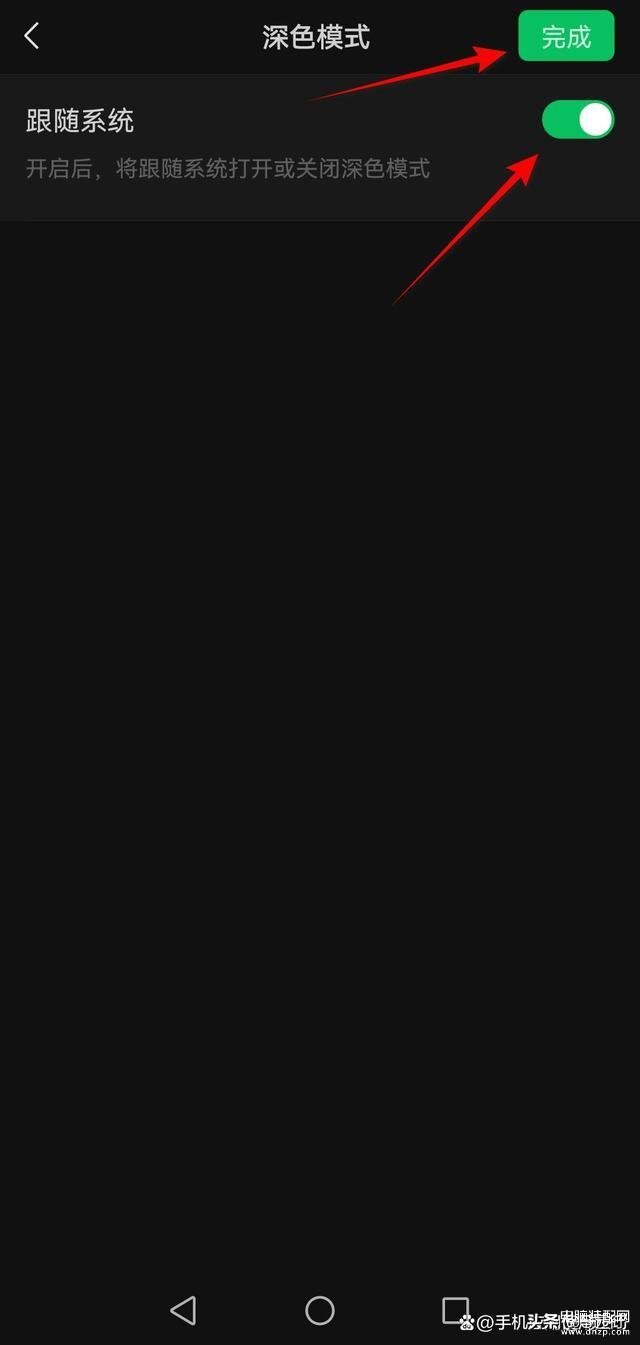 将“跟随系统”旁的小滑块点暗,勾选“深色模式”,点击“完成”。