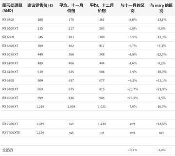 而AMD这边的情况也相似,虽然12月份多款显卡相比11月份确有降价,但是热门的RX 6800、RX 6800 XT等型号依然溢价10-20%,而新一代显卡中RX 7900 XT现在溢价18.5%,RX 7900 XTX因为没啥上市型号,所以没有可比性,有的话恐怕也是大幅溢价。平均下来,AMD这边的显卡相比建议价便宜了3.4%,比N卡那边确实良心一些,但也没有本质的变化。