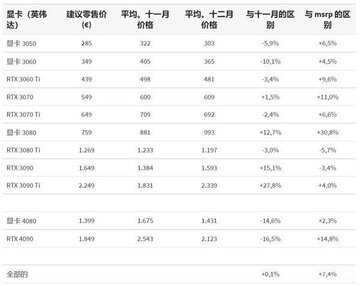 不过新一代显卡中,RTX 4090及RTX 4080在12月份的价格比11月滑落不少,但是相比建议价存在一加,RTX 4090甚至溢价15%左右。总体来说,相比建议价大部分显卡还是高的,就连RTX 3050这样的显卡都有6.5%的溢价,RTX 3080这样的热门型号依然溢价30%以上。