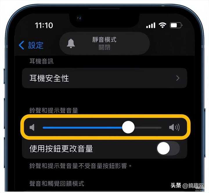 如果想调整「铃声音量」,可以到「声音与触觉回馈」设定内调整,或是打开「使用按钮更改音量」功能,就可以直接透过 iPhone 音量键,在没有播放影音(通话)状态下,透过主画面、解锁画面与第三方 APP 下都能调整铃声大小。