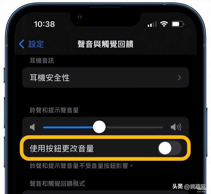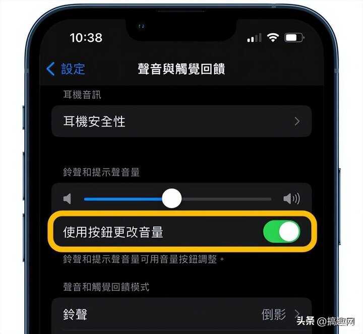 要是想按压 iPhone 音量键可以控制「铃声音量」取代原本预设「媒体音量」,那就要开启「使用按钮更改音量」。