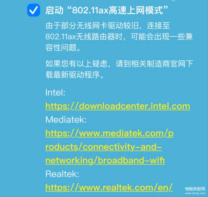 无线设置也叫做wifi设置,如果你的路由器的wifi6路由器,那么它会提示你是否开启802.11ax高速上网模式。