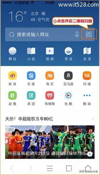 (1)、打开手机浏览器(此处以UC浏览器为参考),点击浏览器自带扫描二维码功能。如下图: