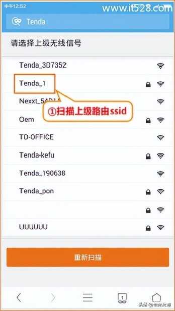 登录到腾达无线信号扩展器设置页面后,会自动扫描附近的WiFi信号,在扫描结果中,选择需要被扩展的WiFi信号即可。如下图: