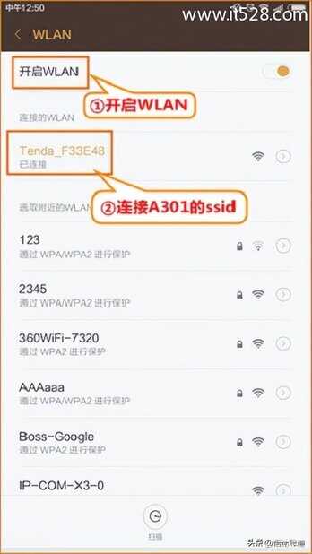 打开你手机上的WLAN,然后搜索连接到腾达无线信号扩展器的默认WiFi,如下图:
