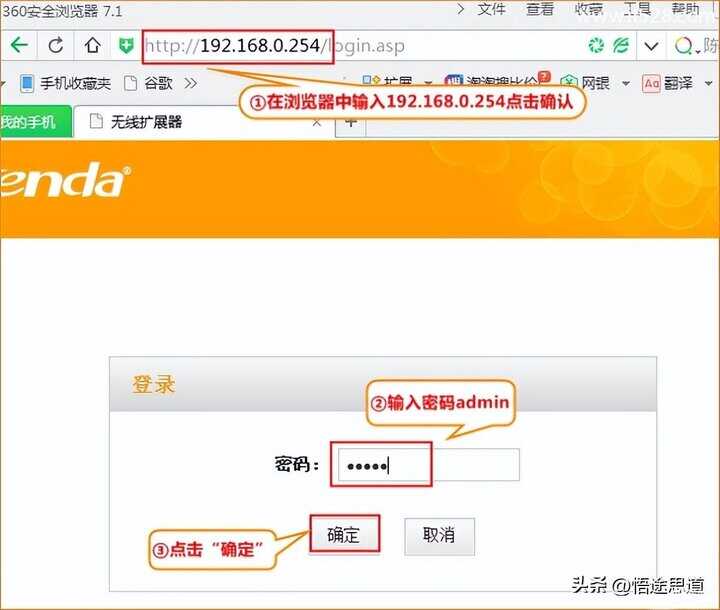 在浏览器中输入:192.168.0.254(或者输入re.tendacn.com) 按回车键——>在跳转的页面中输入密码 “admin” ——>点击“确定”,如下图: