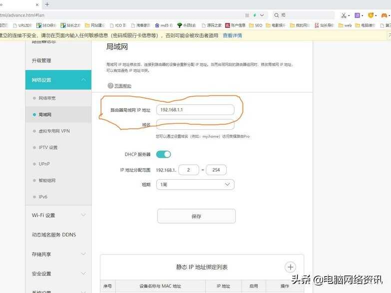 如何解决这个问题呢?只要我们将两台路由器中任意一台IP地址修改一下就可以了,即是打开下图路由器后台管理界面(其他路由器面页有差别,这里是修改路由器局域网IP地址有些路由器写着 LAN口IP地址意思是一样的)如下图红圈标识中改成了IP地址192.168.1.1,然后重启路由器后,其他所连接的这个路由器的设备终端就可以上网了,不会产生冲突,假如修改的这个路由就是主客厅的路由那么它的地址就是192.168.1.1变成了两个不同网段的网络,这样两个路由器之间都可以连接网络了。