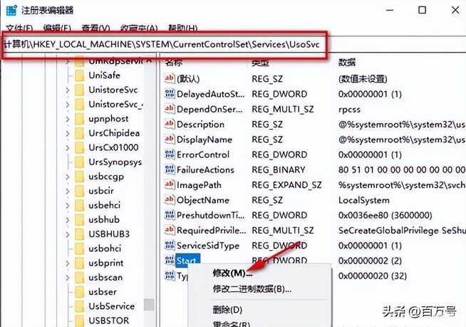 2、在注册表设置中,找到并定位到 [HKEY_LOCAL_MACHINE\SYSTEM\CurrentControlSet\Services\UsoSvc] (包括HKEY_LOCAL_MACHINE\SYSTEM\CurrentControlSet\Services\WaaSMedicSvc,操作完全一致)。然后在右侧找到“Start”键。