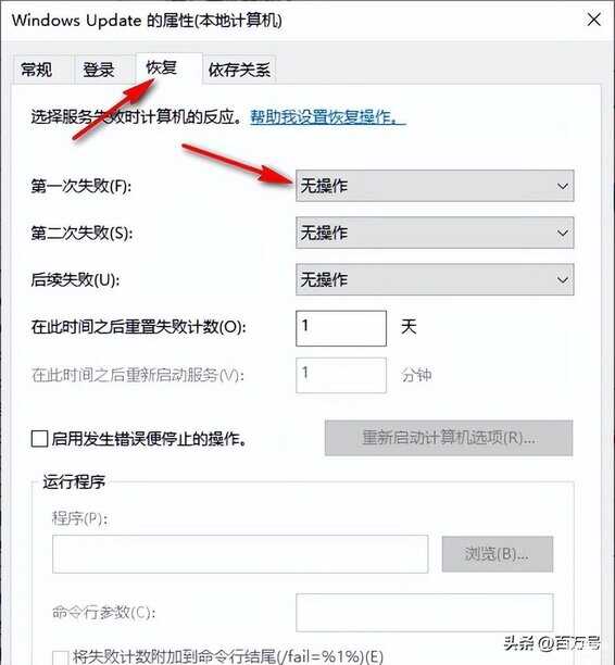 4、接下再切换到“恢复”选项,将默认的“重新启动服务”改为“无操作”,然后点击“应用”“确定”。