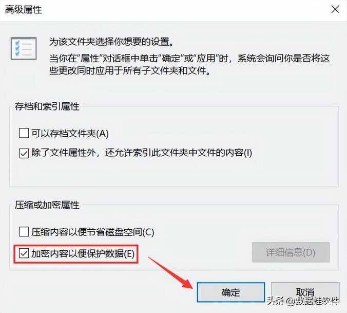 3. 之后就会继续弹出一个窗口,在压缩或加密属性下,选择“加密内容以便保护数据”即可。