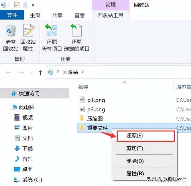 我们删除的文件一般都会经过回收站,所以你只需要打开电脑“回收站”,在里面找到你要恢复的文件,选中它,右键点击“还原”就可以恢复在电脑桌面上了。