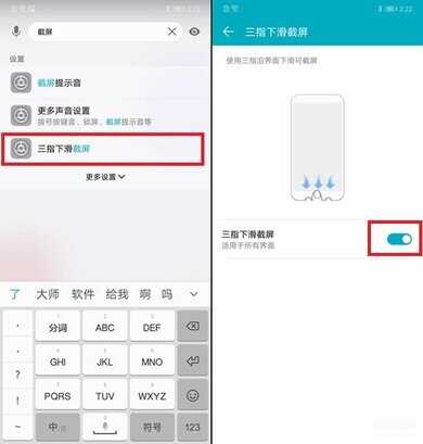 当然,别忘了先开启三指截屏的开关:桌面下滑搜索“截屏”,开启三指下滑截屏的开关即可。