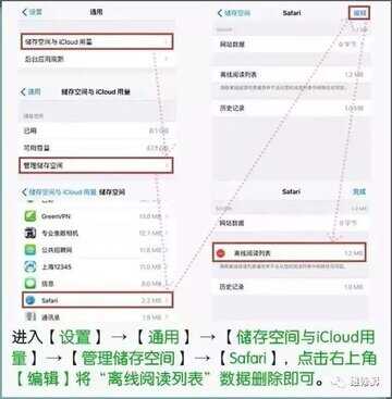 当我们使用一些应用的时候,经常会存储一些离线数据,例如Safari就会在你在线浏览是自动保存一些数据供你离线时使用。依次点击进入:【设置】——【通用】——【储存空间与iCloud用量】——【管理储存空间】——【Safari】——【编辑】——【离线阅读列表】。