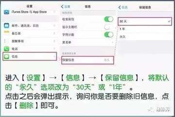 一般苹果手机的默认设置会永久保存你所有发送/接收的短信,这一功能伴随着手机使用时间变长,就会极大的占用手机内存,因此最好将其更改保存时间为30天或一年。