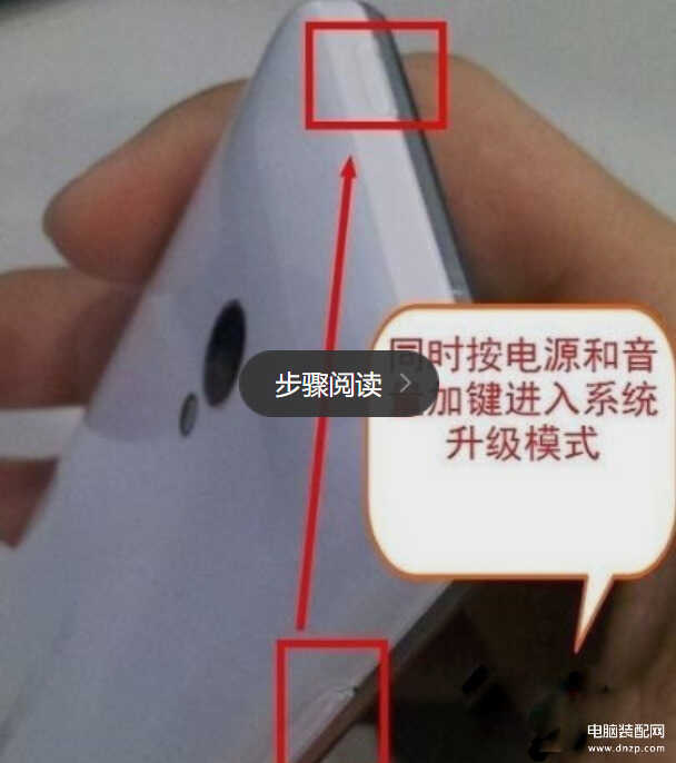4、这时先将手机与电脑用USB连接起来,然后同时按下电源和音量加号键,如下图所示。