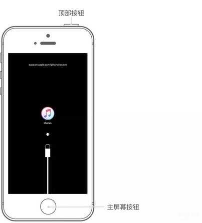 iPhone 6s 及更早机型、iPad 或 iPod touch:同时按住主屏幕按钮和顶部(或侧边)按钮。一直按住这两个按钮,直到您看到恢复模式屏幕。