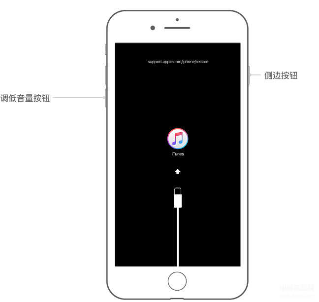 iPhone 7 或 iPhone 7 Plus:同时按住侧边按钮和调低音量按钮。一直按住这两个按钮,直到您看到恢复模式屏幕。