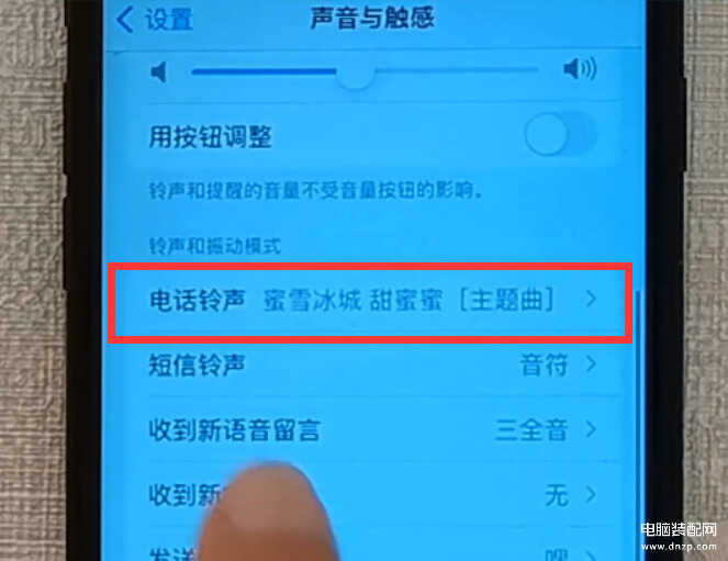 然后点击“声音和触感”,进入“声音和触感”界面,我们在“电话铃声”的选项里,就可以看到,电话铃声已经是《蜜雪冰城甜蜜蜜》(如下图)。