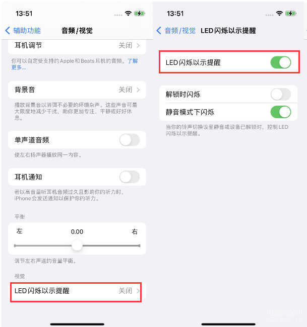 打开“LED闪烁以示提醒”开关即可。