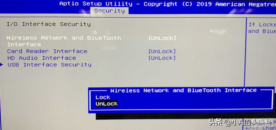 若在“设备管理器”中并没有无线网卡设备,可能是BIOS中禁用该设备,开机连续按F2进入BIOS界面,找到Security > I/O Interface Security > Wireless Network选项,查看选择是否为UnLock,若不是,选择后并按F10保存并退出即可。