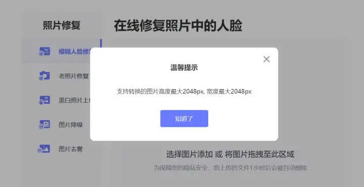 老照片修复→模糊人脸修复→上传图片(注意尺寸不要超过限制)→自动修复