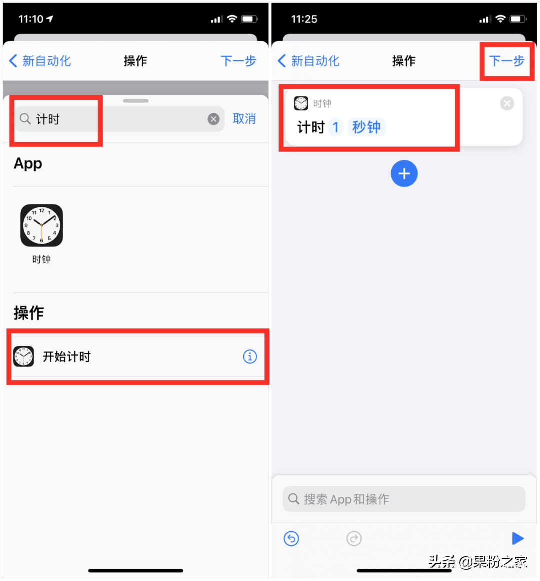3、点击“添加操作”,搜索“计时”并选择“开始计时”;