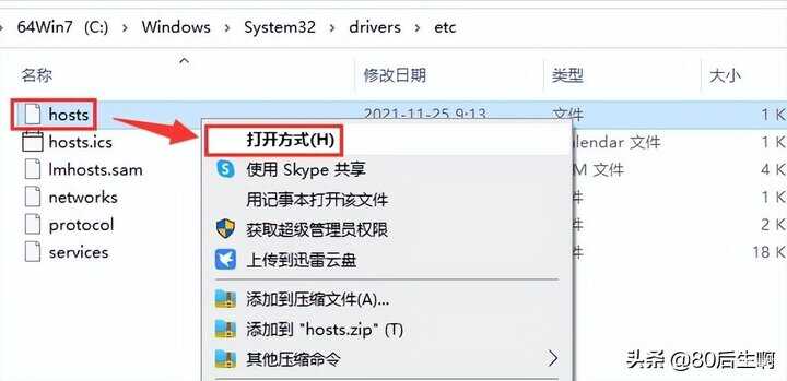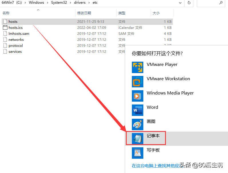 然后就可以定位到系统盘这个目录:C:\Windows\System32\drivers\etc,右击这个hosts文件,点击打开方式,