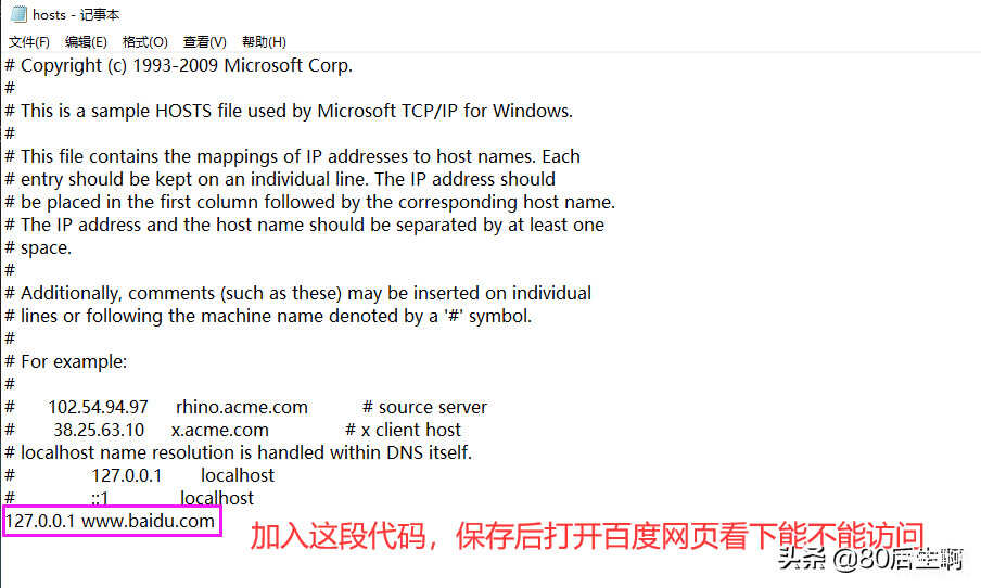 接下来,在打开的hosts文本文档中,输入如下一行命令:127.0.0.1 www.baidu.com