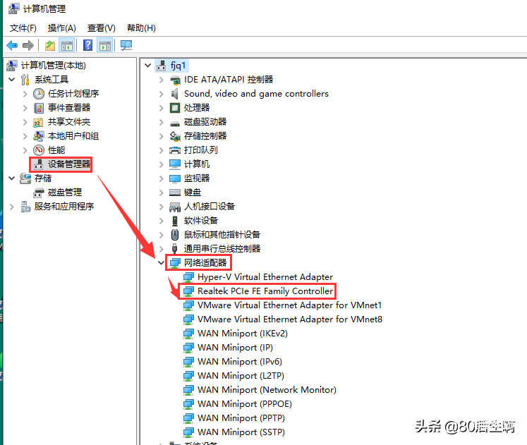点开设备管理器,找到网络适配器,查看带有Realtek PCIe FE/GbE Family Controller字样的设备是否是打感叹号,