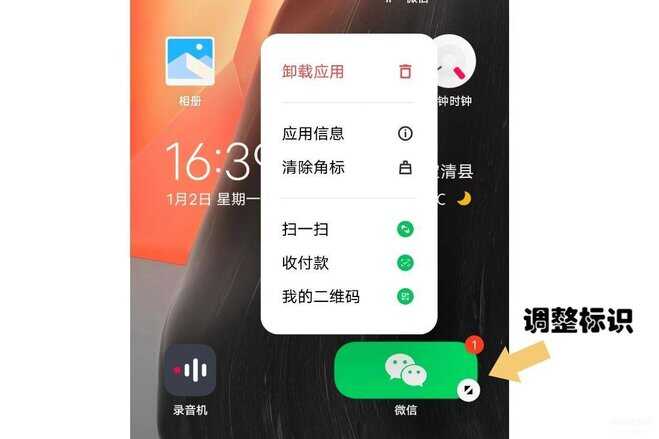 按住微信时,会自动弹出一个菜单,此时不要理会菜单,而是仔细观察应用右下角,会出现一个可以调整、拖拽图标的标识,此时使用手指选中这个小标识,然后拖动它,就可以调整图标的大小了,用户可以让微信(不仅限于微信)的图标占用两个或四个常规图标空间。如下图: