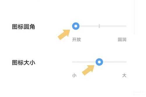 点击进入图标风格、大小与名称,然后拖动图标圆角、图标大小的“游标”,就可以调整图标大小。如下图: