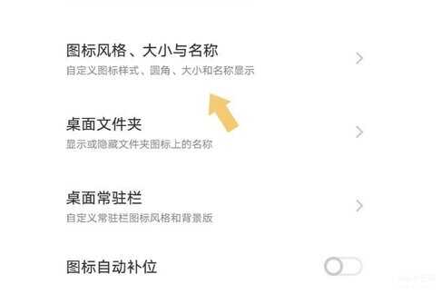 点击进入桌面设置,在弹出的界面里找到图标风格、大小与名称。如下图: