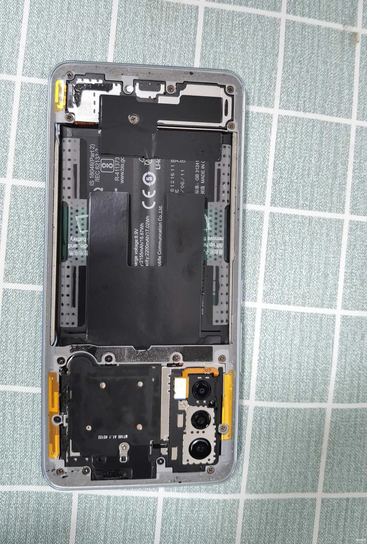 注意,用卡片卡的时候也不能插得太深,我这还是有一点点失误的,在后盖上,摄像头的方形罩子背面有两块减震的垫块,其中一块就被我铲废了。