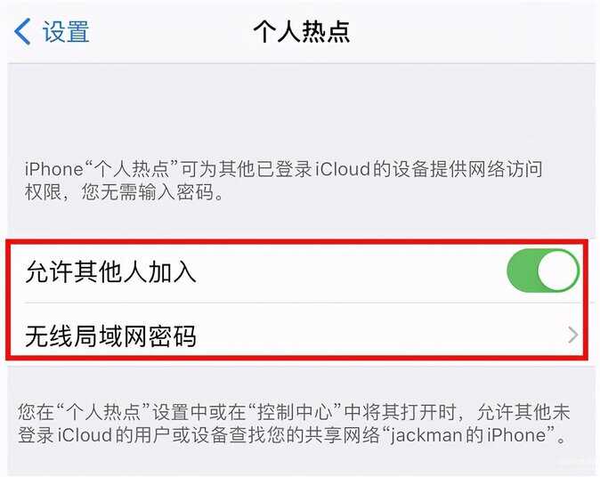 3、在“个人”热点中,启用“允许其他人加入”,设置好“无线局域网密码”即可。