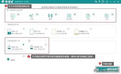 u盘与电脑连接,打开软件页面,会弹出注册窗口,你可以关闭这个窗口,再免费试用。要扫描文件的类型,一般默认全选。文件路径选择可移动驱动器里面的磁盘。选择好后,开始扫描。