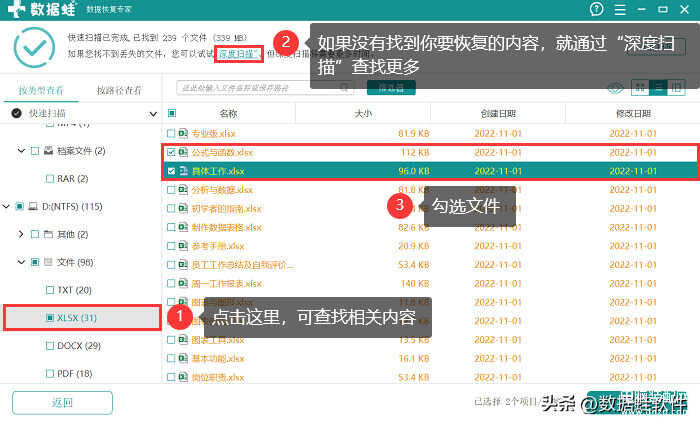 操作步骤:在选择扫描前,先选择要扫描的丢失数据的数据类型以及路径(根据你的实际情况来选择),开始【扫描】;在结果出现后,选择要恢复的文件数据。如果没有找到要恢复的文件,通过二次扫描【深度扫描】来搜索;确认选择无误后,点击【恢复】即可。