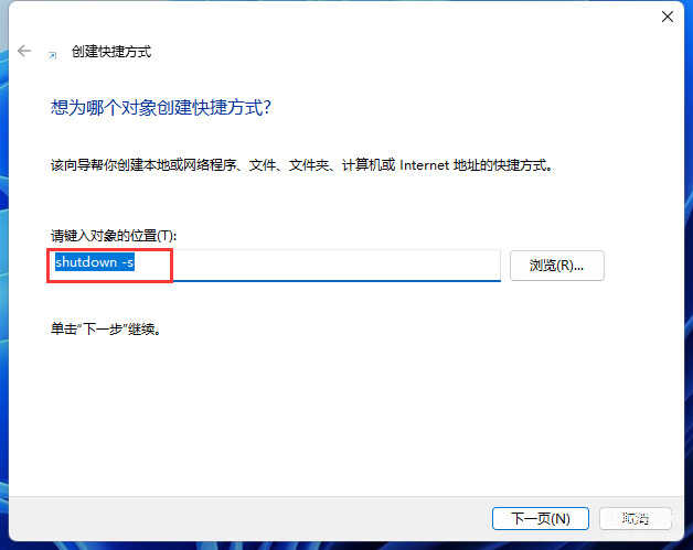 第一步:在桌面上右击,选择新建快捷方式,在弹出的窗口中输入shutdown -s命令,如下图。