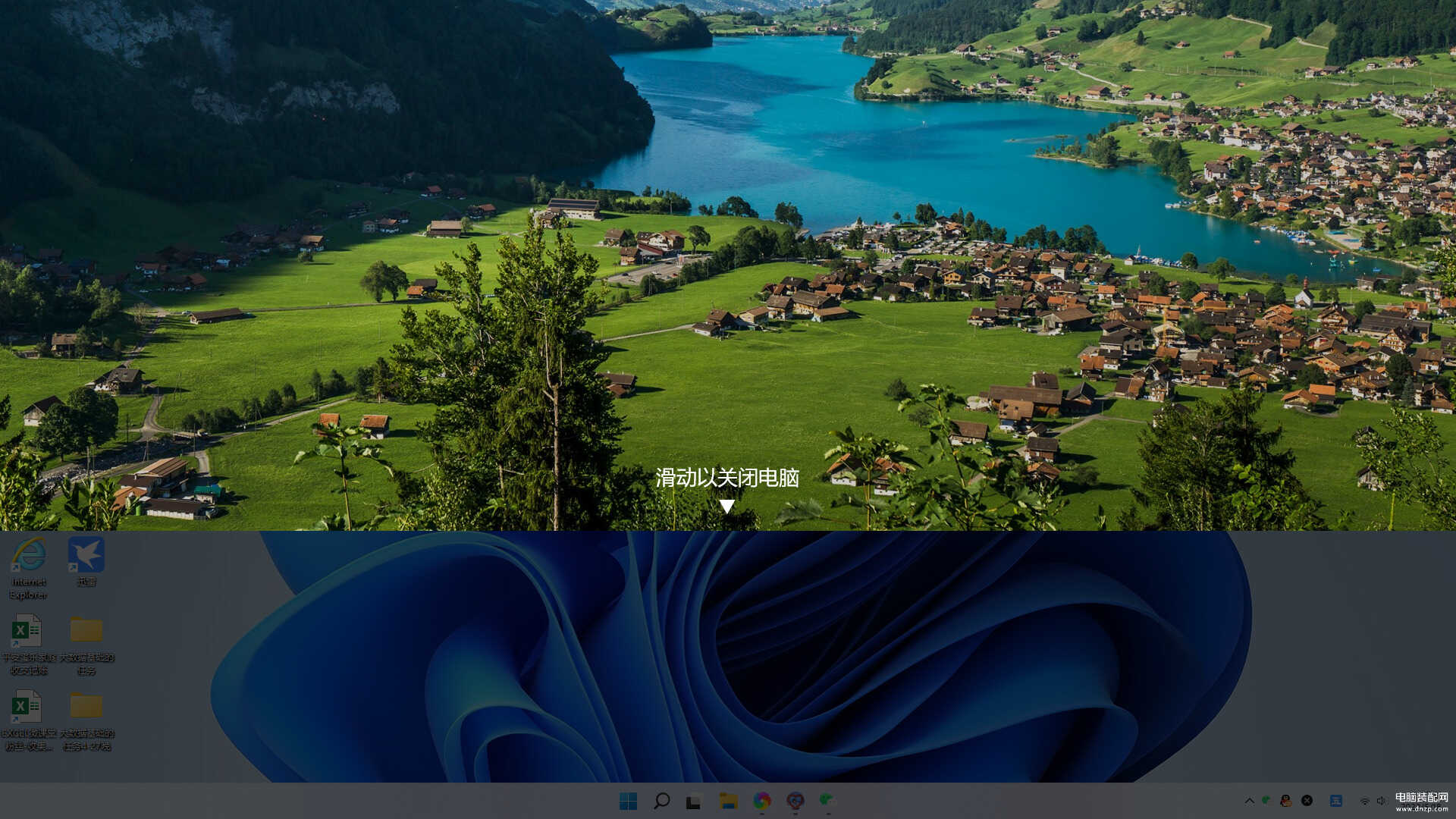 第二步:将锁屏画面拖至屏幕底端,电脑就会启动关机了。