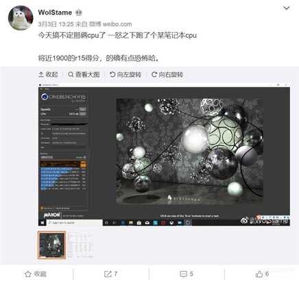 首先,WolStame用这款CPU跑了CineBench R15,多核跑分接近1900分。