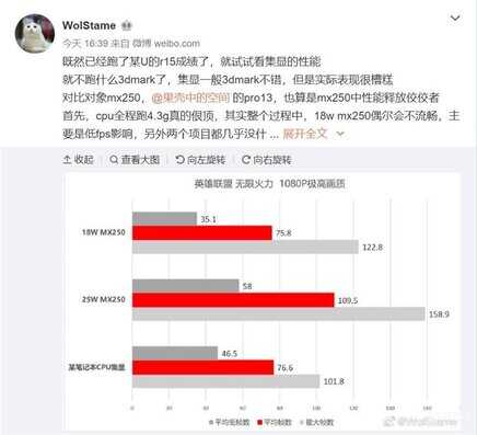 在核显方面,WolStame用《英雄联盟》进行了测试,发现其核显平均帧率相当于18W的MX 250独显,与25W满血版MX 250还存在差距。