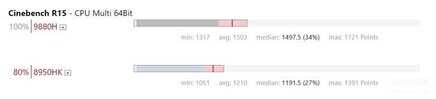 IT之家参照权威外媒NoteBookcheck的CineBench R15跑分库发现,同为8核16线程的i9-9880H平均分为1497.5分,最高分为1721分。