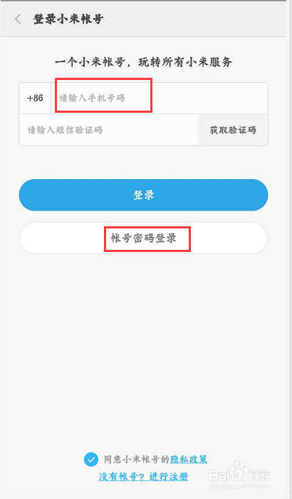 你可以选择用手机号码接收验证码来登录app,也可以使用原本的小米账号和密码来登录。