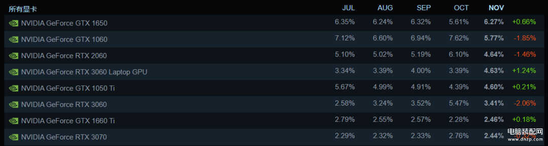 GTX1650在11月超越1060,12月GTX1650继续蝉联榜首。