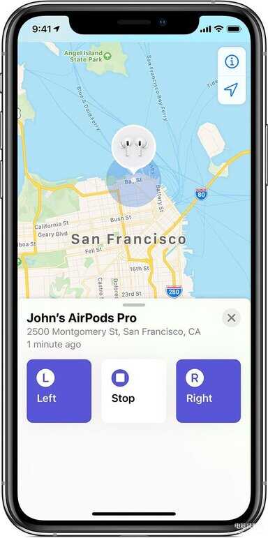 “查找”功能不仅能够帮助用户定位 iPhone 或 iPad 等设备的位置,也可以通过“查找”在地图上查看 AirPods 的位置,并支持播放声音,以便您能找到它所在的位置。