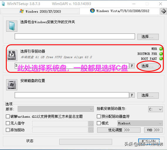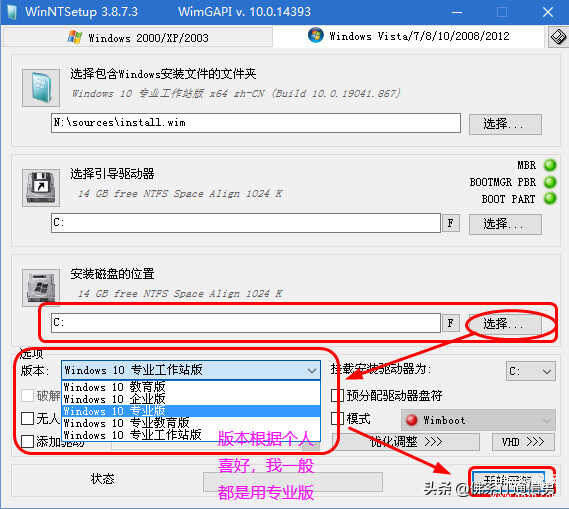 第五步:选择安装磁盘的位置(即系统盘C盘),同时注意下面有一个选项版本(这个安装包里面还有教育版、企业版、专业版、专业教育版、专业工作站版),根据个人喜好选择版本,建议使用专业版;